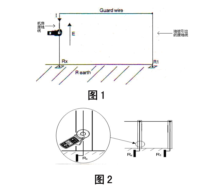 1、如果以機(jī)房為中心的半徑10米范圍內(nèi)沒有用作檢測的輔助接地裝置,則需在原機(jī)房接地裝置的1平方米面積中再次打入一根深度不小于1.0——1.5米的地樁作為檢測回路的輔助接地端。再從其地樁上引出一根截面積不小于16平方毫米的黃綠銅質(zhì)接地線與機(jī)房原接地相連形成檢測回路(如圖1所示)。打開鉗型接地電阻測試儀,切換到電阻測量功能,將儀器套住機(jī)房接地線端(如圖2所示),即可測得機(jī)房的接地電阻阻值Rx。按要求,所測得的接地電阻阻值應(yīng)不大于4歐姆。同理將測試儀套住獨(dú)立接地裝置引出的黃綠接地線,可測得輔助接地裝置的接地電阻阻值R1。